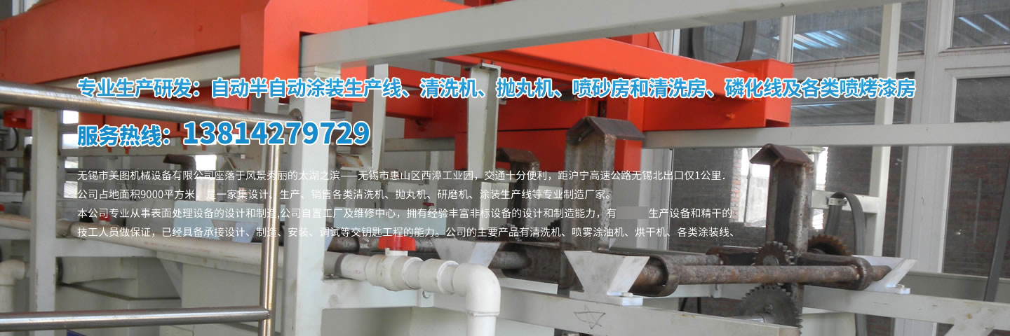 無(wú)錫市美圖機(jī)械設(shè)備有限公司座落于風(fēng)景秀麗的太湖之濱——無(wú)錫市惠山區(qū)西漳工業(yè)園,交通十分便利,距滬寧高速公路無(wú)錫北出口僅1公里.公司占地面積9000平方米,是一家集設(shè)計(jì)、生產(chǎn)、銷(xiāo)售各類(lèi)清洗機(jī)、拋丸機(jī)、研磨機(jī)、涂裝生產(chǎn)線(xiàn)等專(zhuān)業(yè)制造廠(chǎng)家。